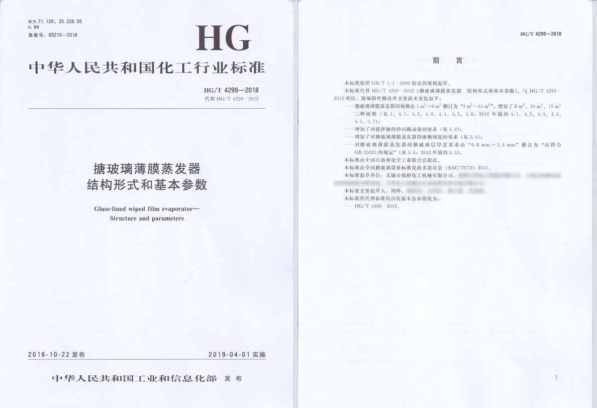 無錫錢橋化工機(jī)械有限公司參與起草中華人民共和國化工行業(yè)標(biāo)準(zhǔn)HG/T 4299-2018《搪玻璃薄膜蒸發(fā)器結(jié)構(gòu)形式和基本參數(shù)》。