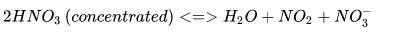 4、硝酸的氧化性與其濃度成正比。稀硝酸與金屬反應(yīng)生成一氧化氮,濃硝酸與金屬反應(yīng)同樣也會生成一氧化氮,但濃硝酸的氧化性比稀硝酸強(qiáng),一氧化氮剛反應(yīng)出來,就被硝酸根離子在氫離子存在的情況下氧化成二氧化氮。方程式如下: