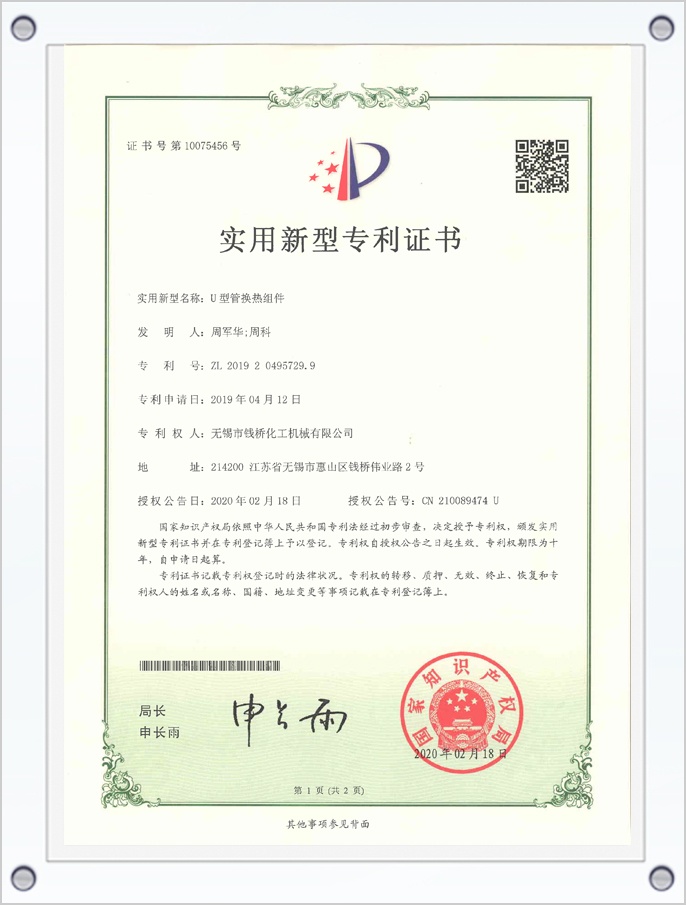 搪瓷管板型碳化硅化熱器專(zhuān)利證書(shū)