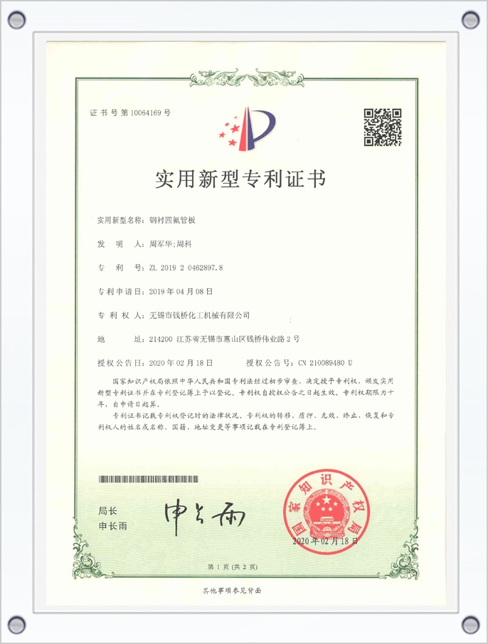 鋼襯四氟管板專(zhuān)利證書(shū)