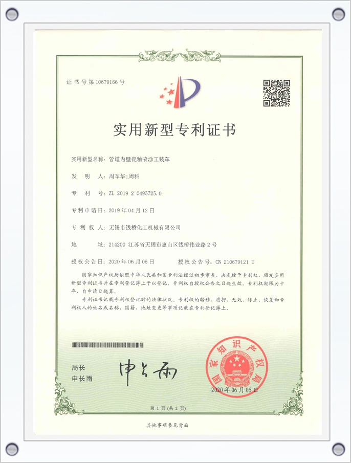 管道內(nèi)壁瓷釉噴涂工裝車(chē)專(zhuān)利證書(shū)