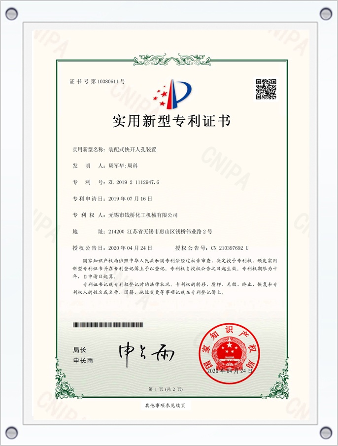 裝配式快開(kāi)人孔裝置專(zhuān)利證書(shū)