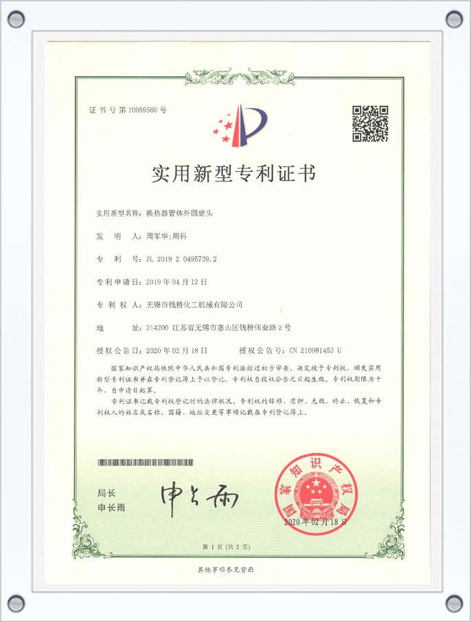 換熱器管體外圓磨頭專(zhuān)利證書(shū)