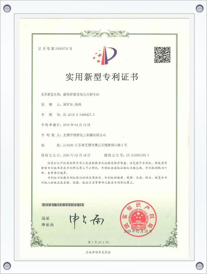 碳化硅管體雙頭打磨車(chē)床專(zhuān)利證書(shū)