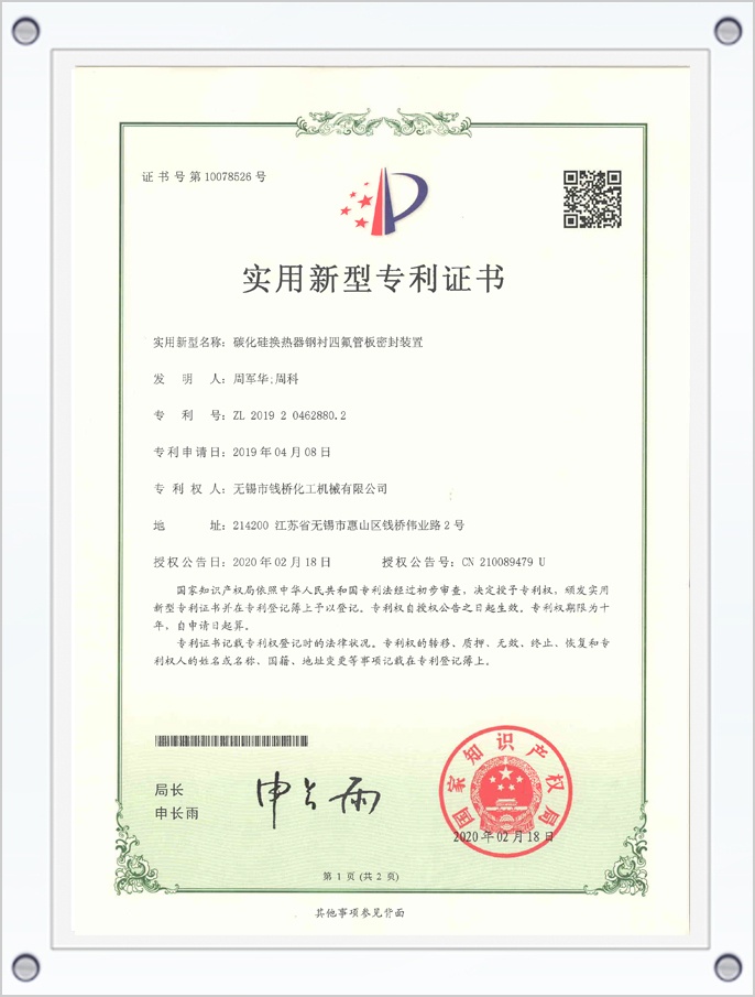 碳化硅換熱器鋼襯四氟管板密封裝置專(zhuān)利證書(shū)