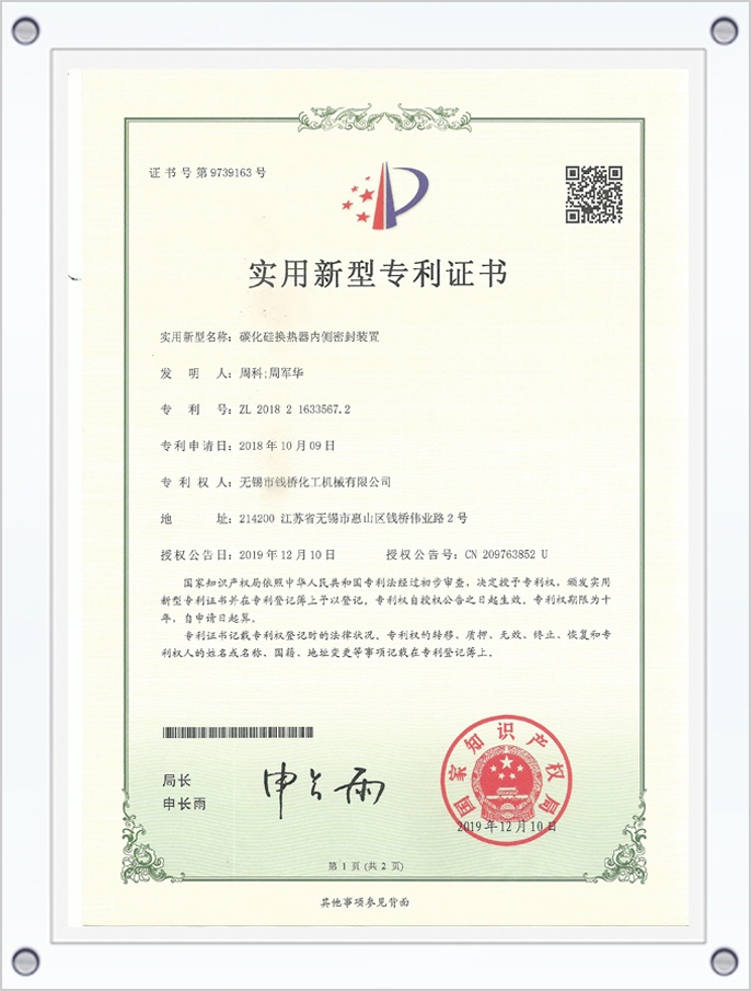 碳化硅換熱器內(nèi)測(cè)密封裝置專(zhuān)利證書(shū)
