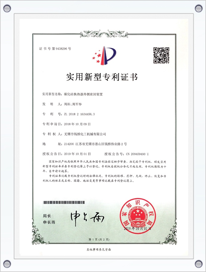 碳化硅換熱器外側(cè)密封裝置專(zhuān)利證書(shū)