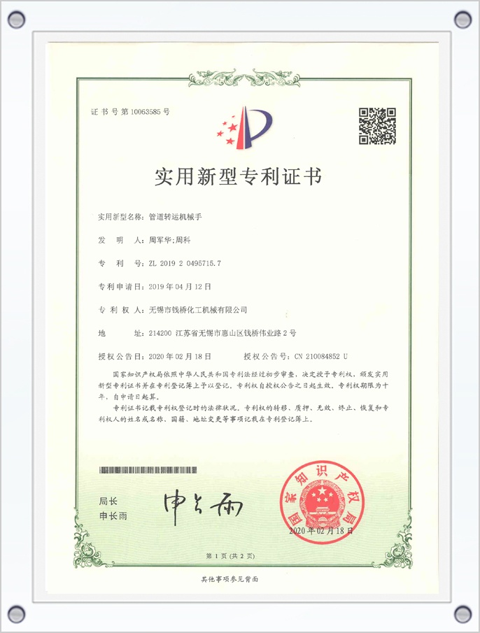 管道轉(zhuǎn)運(yùn)機(jī)械手專(zhuān)利證書(shū)