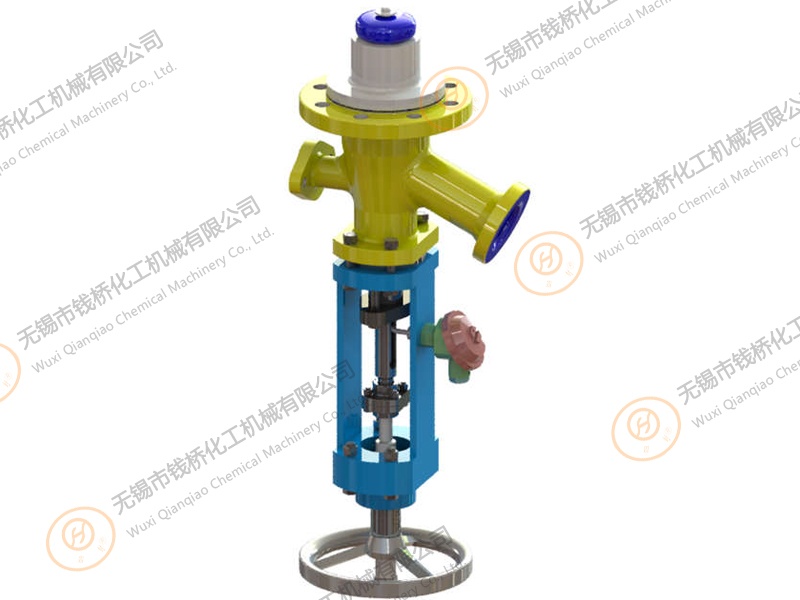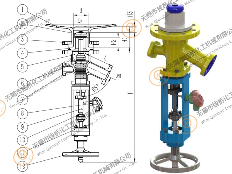 Bottom outlet valve (65°) gap free with handwheel,搪玻璃上展式手動(dòng)放料閥 *內(nèi)置測(cè)溫手動(dòng)放料閥.Can not be used for liquids containing fluoride ions (such as hydrofluoric acid, etc.), nor can it be usedfor strong alkalis and concentrated phosphoric acid with a temperature ≥180