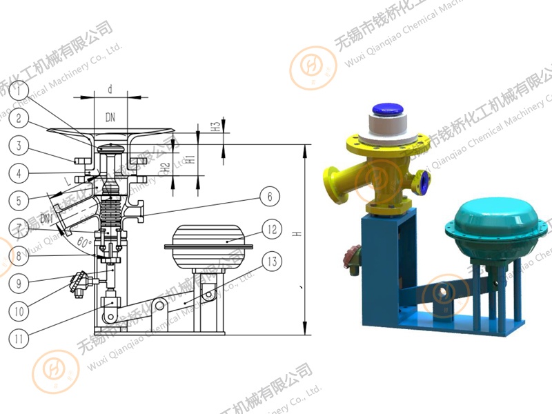 Bottom outlet valve (60°) gap free with pneumatic actuator(Side cylinder)搪玻璃上展式自動(dòng)放料閥(側(cè)向執(zhí)行機(jī)構(gòu)) *內(nèi)置測(cè)溫氣動(dòng)放料閥.The inorganic acid, organic acid, weak alkali solution and organic solvent are superior to stainless steel in strong corrosive media such as hydrochlor